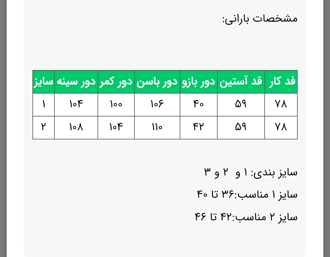 سایز 1 مناسب 36 تا 40 با دورسینه 104