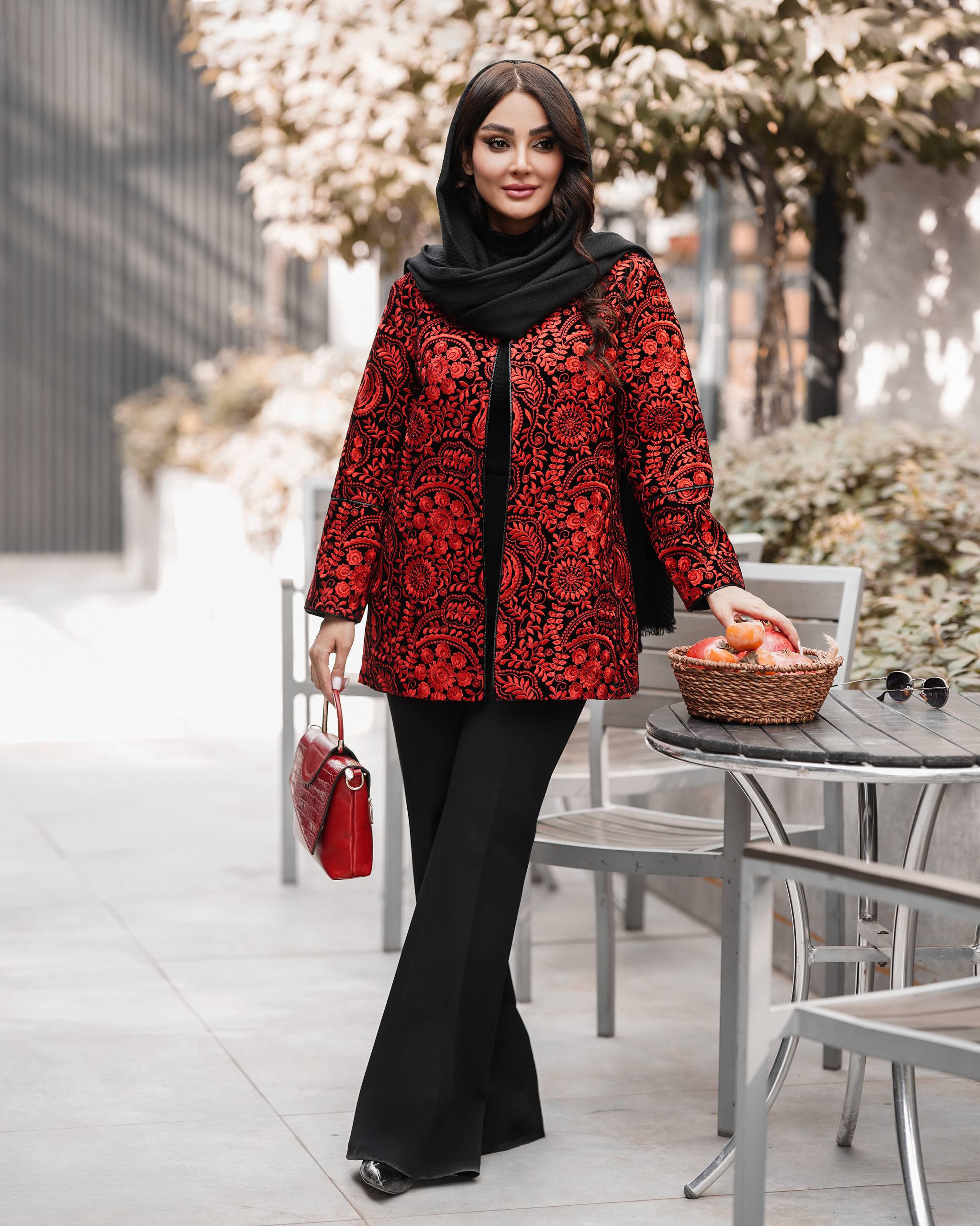مدلی شیک از کالکشن یلدا که با پارچه هندی اصل و دوخت صنعتی تهیه شده و داخل کار بهطور کامل لایی پرشین خورده تا ایستایی عالی و فرم مرتب روی بدن داشته باشد. این کت انتخابی جذاب برای شب یلدا و مهمانیهای زمستانی است.