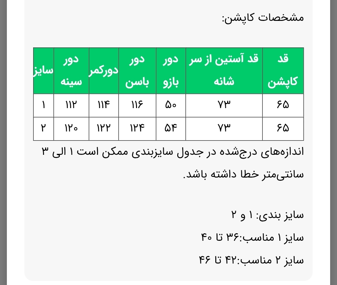 سایز ۲ مناسب ۴۴ تا ۴۸ با دور سینه ۱۲۰ سانتیمتر.