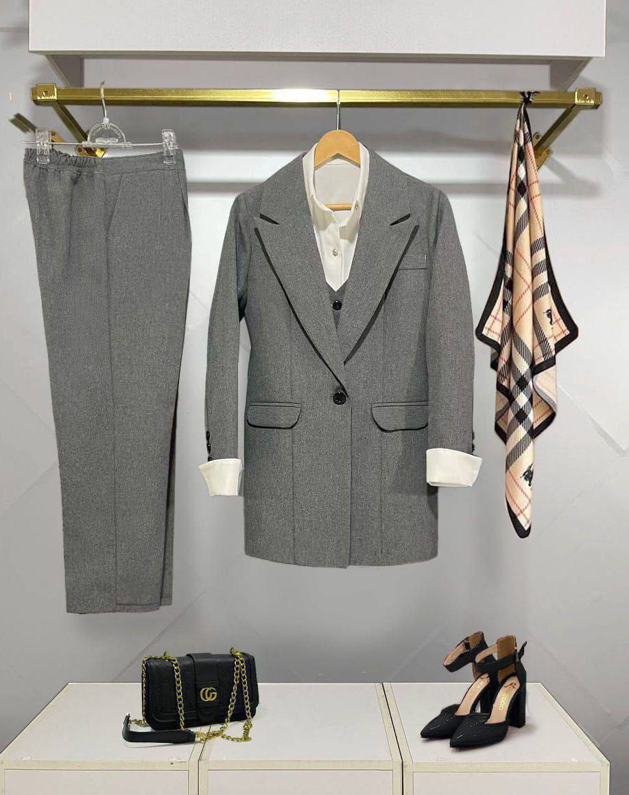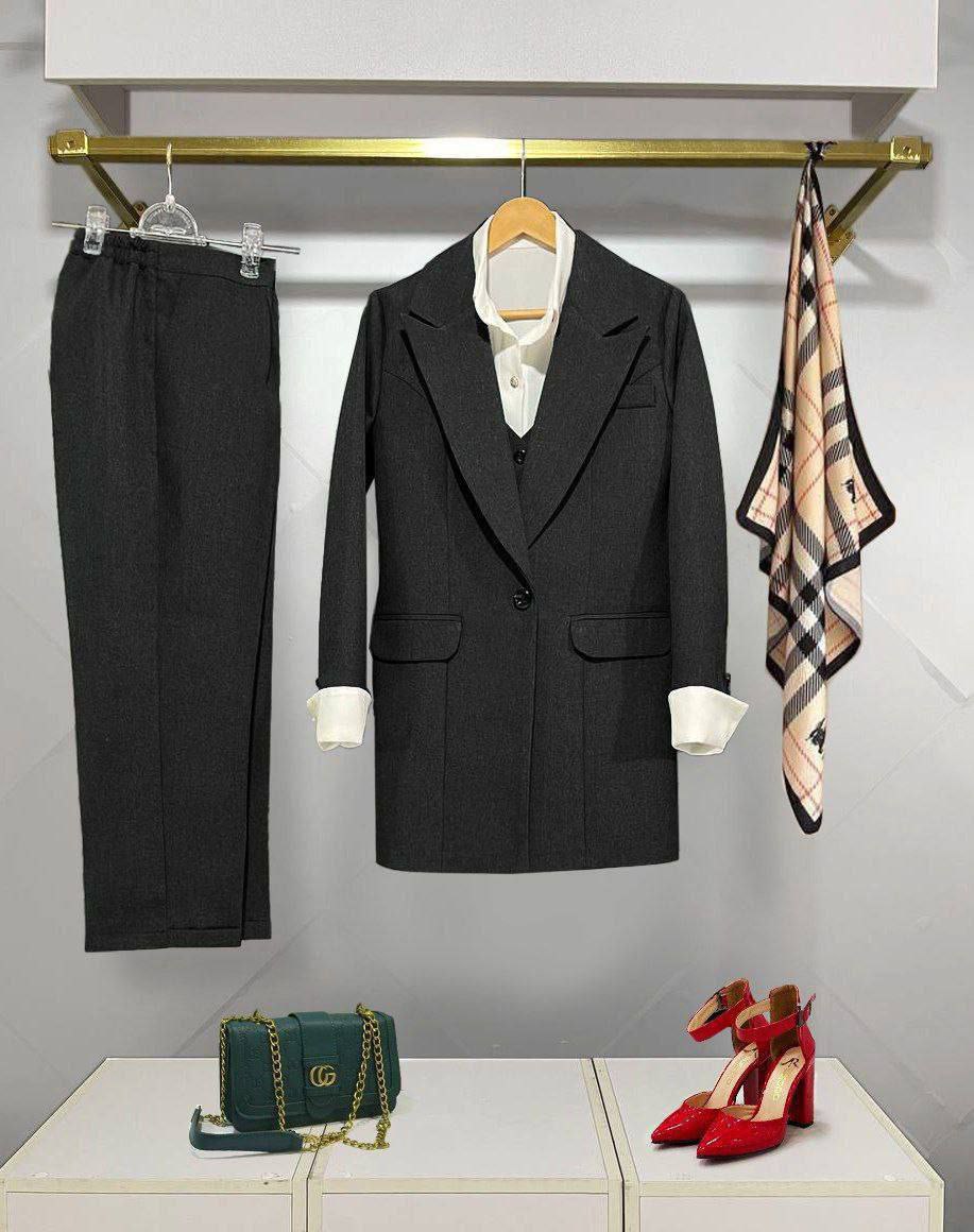 یک انتخاب شیک، کامل و بیدردسر برای استایلهای رسمی و نیمهرسمی است. این ست شامل کت، شلوار، جلیقه و شومیز بوده و با طراحی خوشفرم و پارچههای باکیفیت، تنخوری مرتب و چشمنواز دارد.