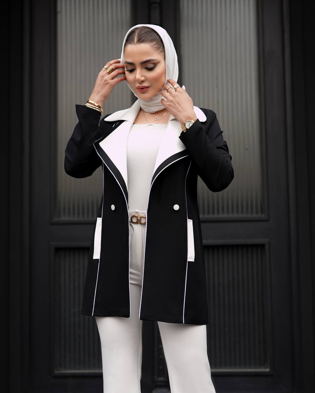 برای فرمدهی بهتر، جلوی کار لایی پرشین کار شده و بسته شدن مانتو با دکمه انجام میشود که جلوهای مرتب و کلاسیک به استایل میدهد. رنگ مشکی آن، این مدل را به آیتمی کاربردی و همیشهمد تبدیل کرده است.
