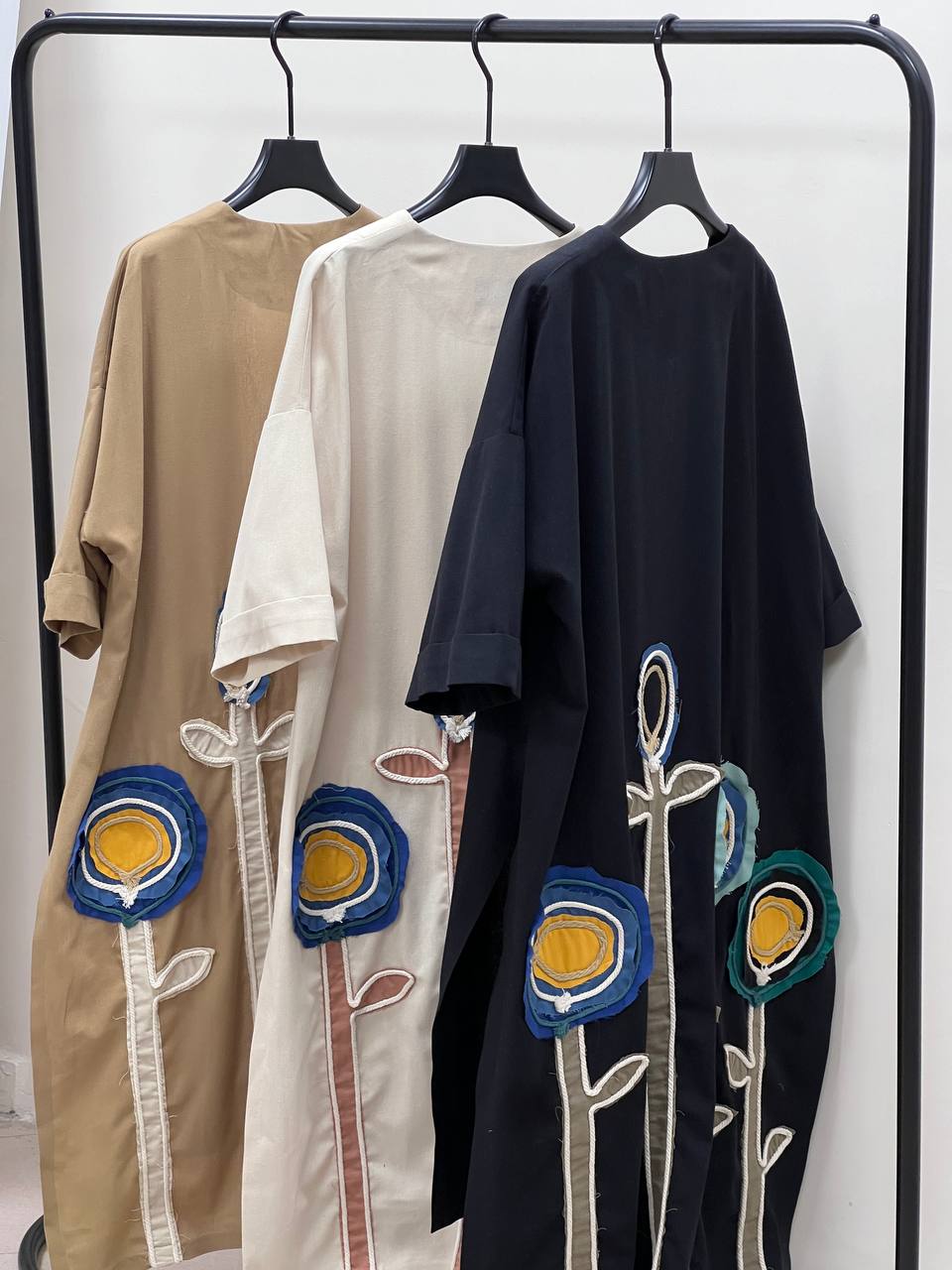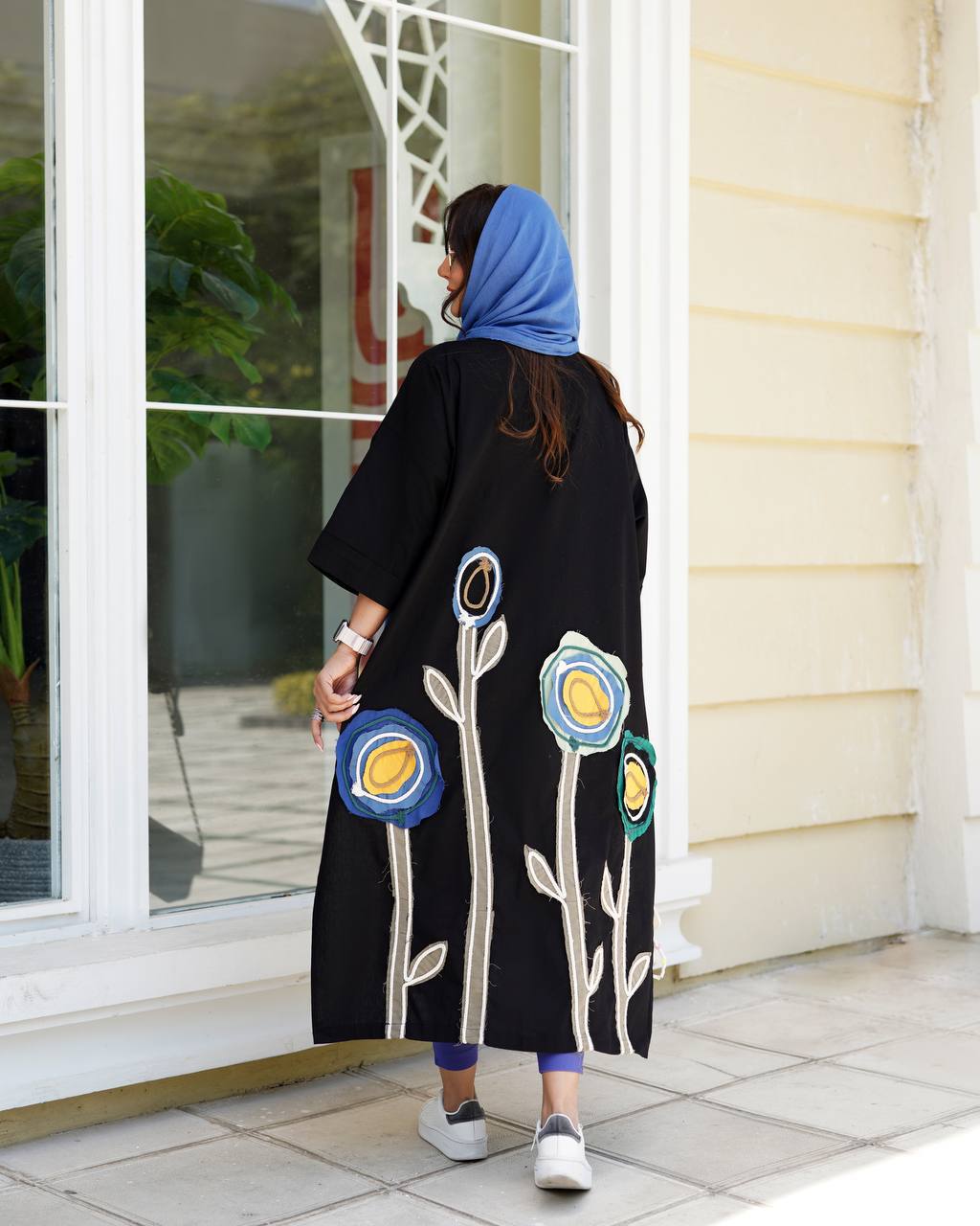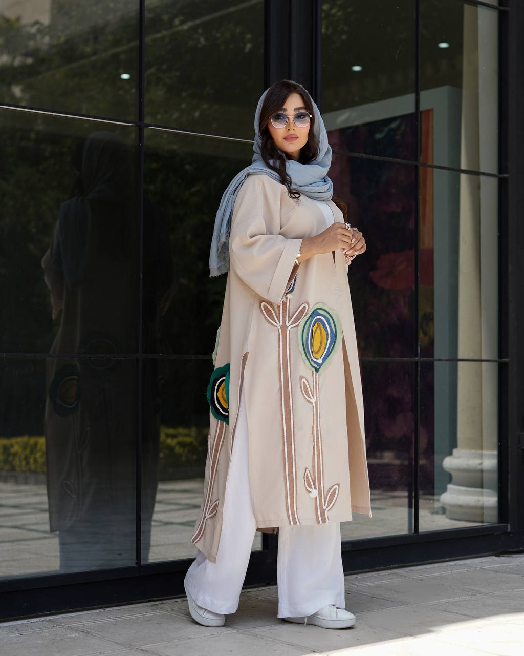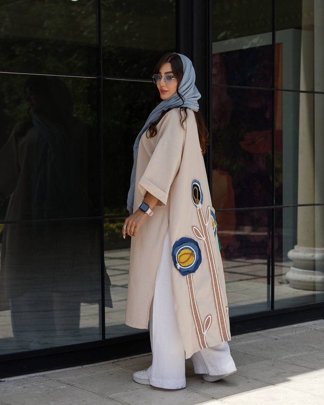 این طراحی باعث میشود مانتو هم راحت و هم خاص و ترند باشد، و با گلهای سفید روی پارچه جلوهای زیبا برای نوروز ایجاد کند.