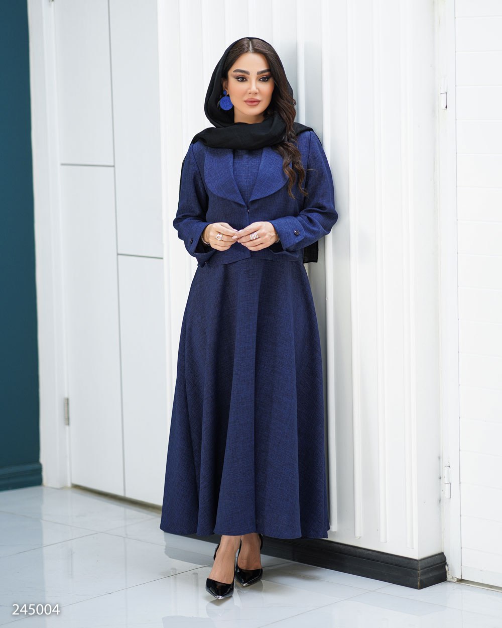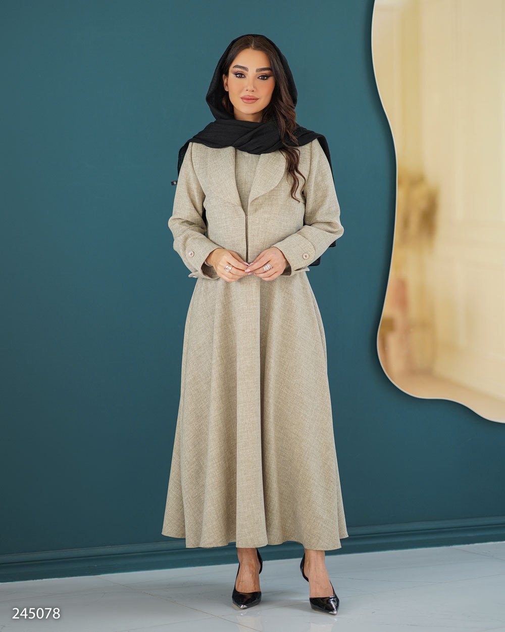 سارافون دارای زیپ در قسمت پشت برای پوشیدن راحتتر بوده و کراپ کت با قزن مخفی بسته میشود. یقه آرشال در کراپ کت، استایل را رسمیتر و جذابتر نشان میدهد و برای مهمانیها، دورهمیها و استایل خاص روزانه گزینهای عالی است.