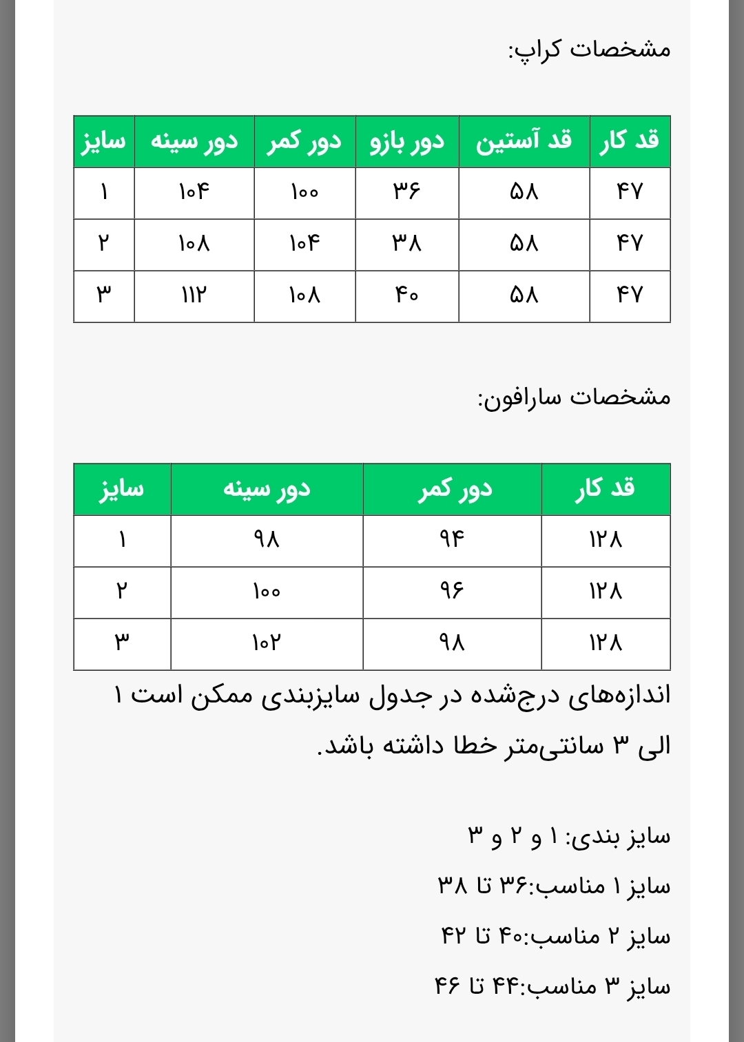 دور سینه سارافون: 100 | دور سینه کراپ کت: 108