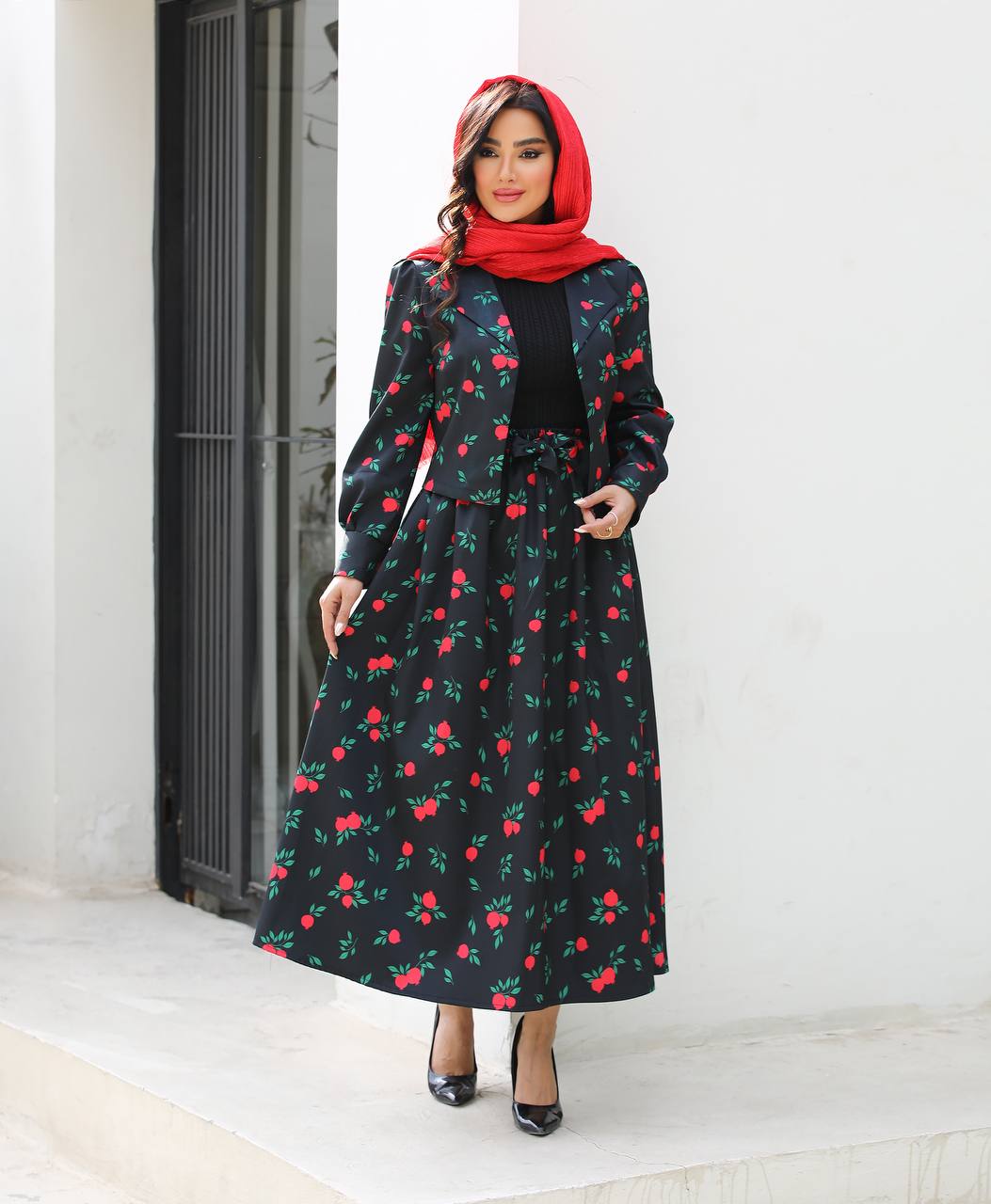 کت و دامن یلدایی زنانه کرپ طرح دار مدل انار سایز ۳۸ تا ۴۸ اصالت ضمانت کالا